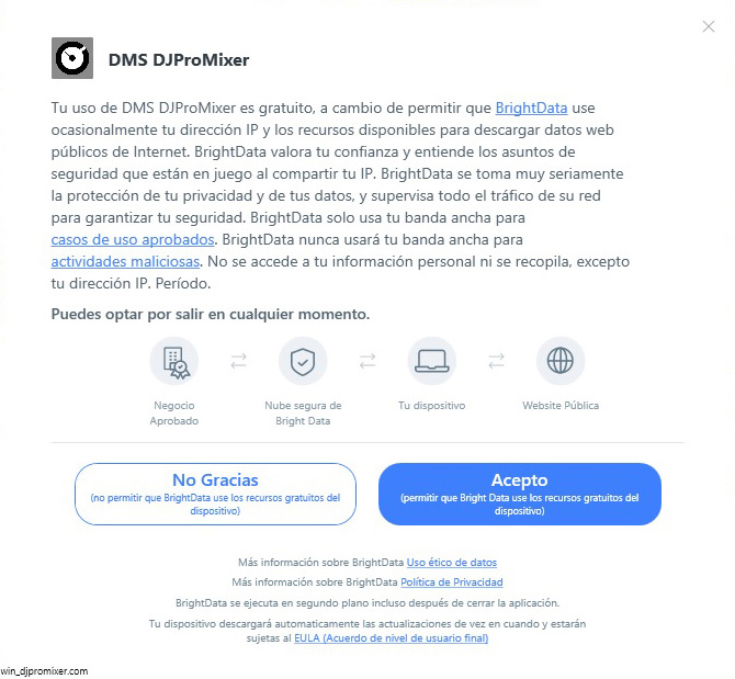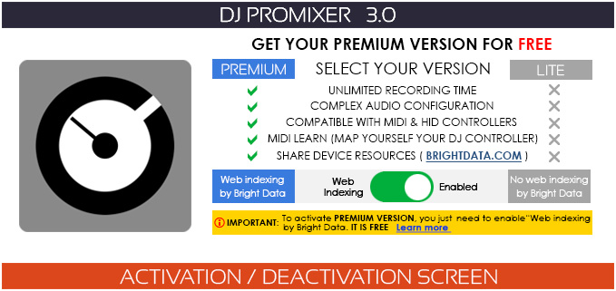 DJ ProMixer offers two modes: LITE and PREMIUM, both of which are entirely FREE. In return for some of the premium features of DJ ProMixer, you may choose to be a peer on the Bright Data network. By doing so you agree to have read and accepted the Terms of Service of the Bright SDK EULA: https://bright-sdk.com/eula and Bright Data’s Privacy Policy: https://bright-sdk.com/privacy-policy . You may opt out of the Bright Data network by clicking “LITE” version on the “Activation Screen” of DJ ProMixer application.