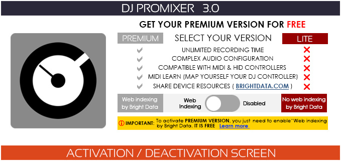 To deactivate the Premium version, you may opt out of the Bright Data network by clicking “LITE” version on the “Activation Screen” of DJ ProMixer, Premium version will revert to the Free Home (Lite) version.