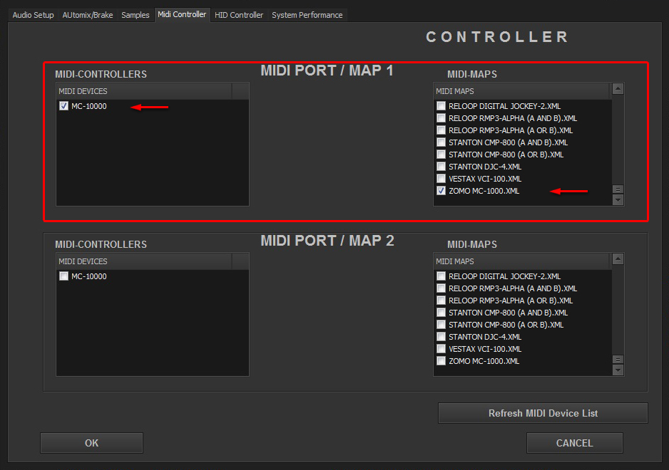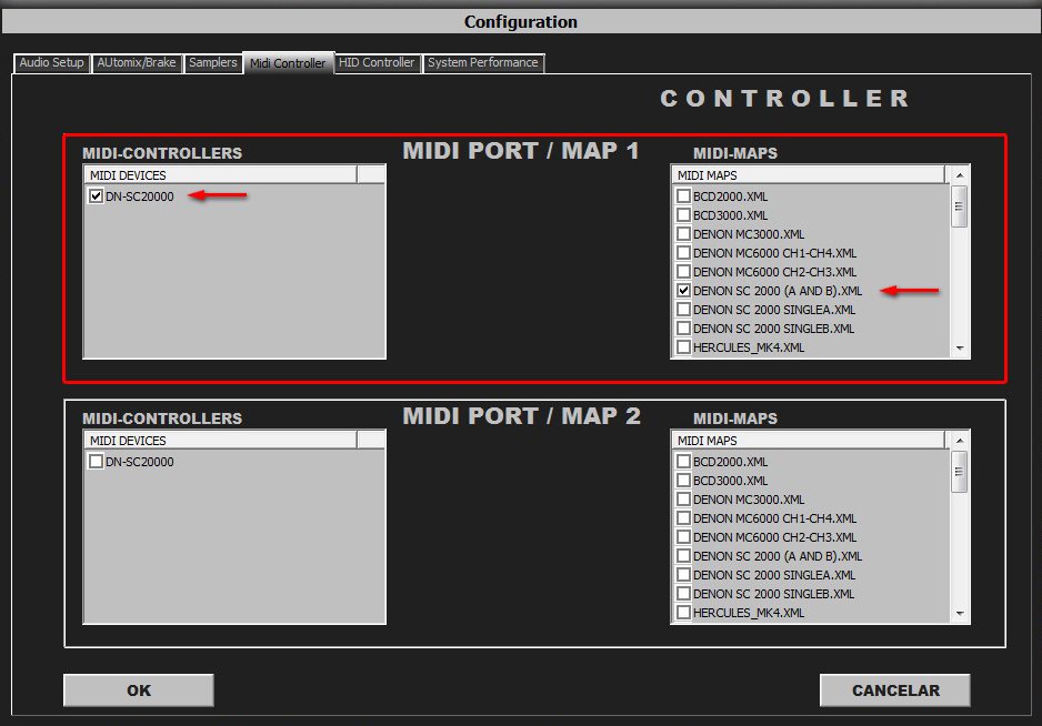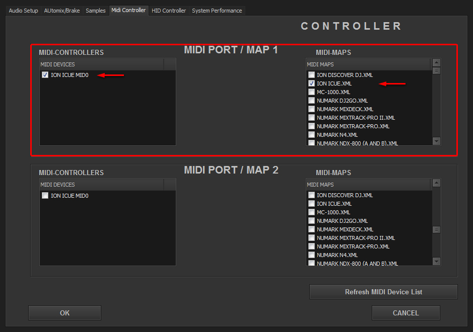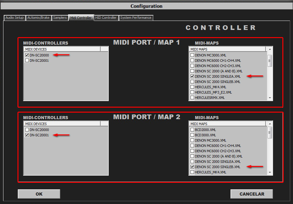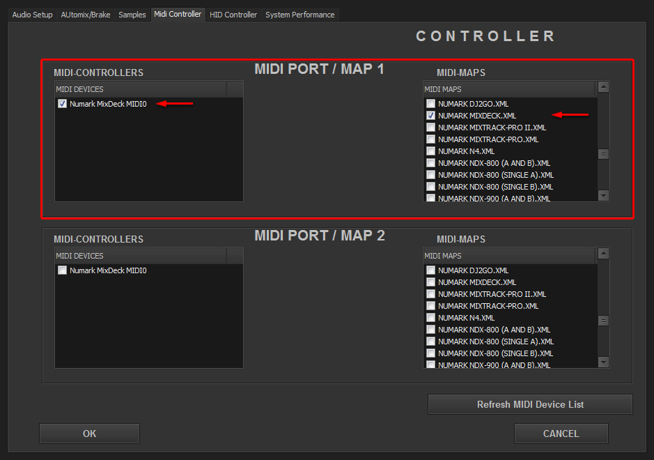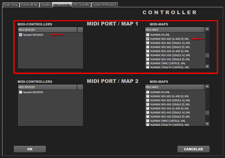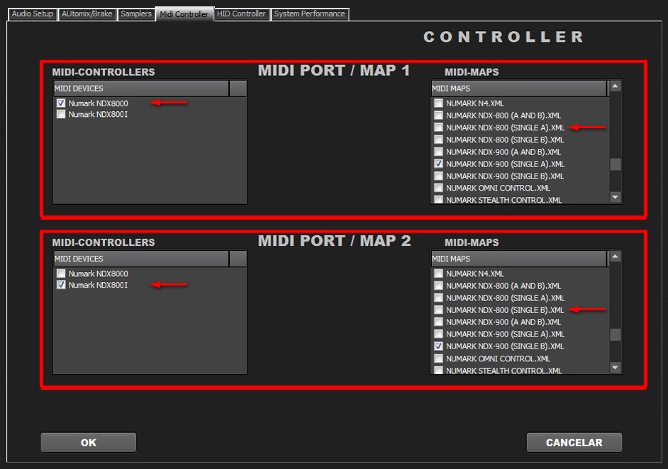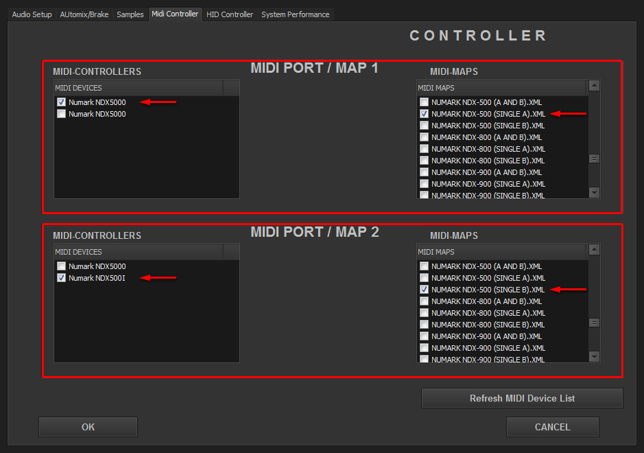 Select in MIDI PORT / MIDI MAP 1 on the left side one device (Numark NDX500 0) and select on the right side NUMARK NDX-500(SINGLE A).XML. Select in MIDI PORT / MIDI MAP 2 on the left side the other device (Numark NDX500 I) and select on the right side NUMARK NDX-500(SINGLE B).XML