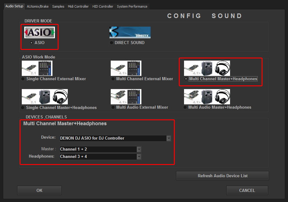 Open DJ ProMixer and go to “Config”, open “Audio Setup”, here you can select your Numark NDX-500 as Audio Sound Card.