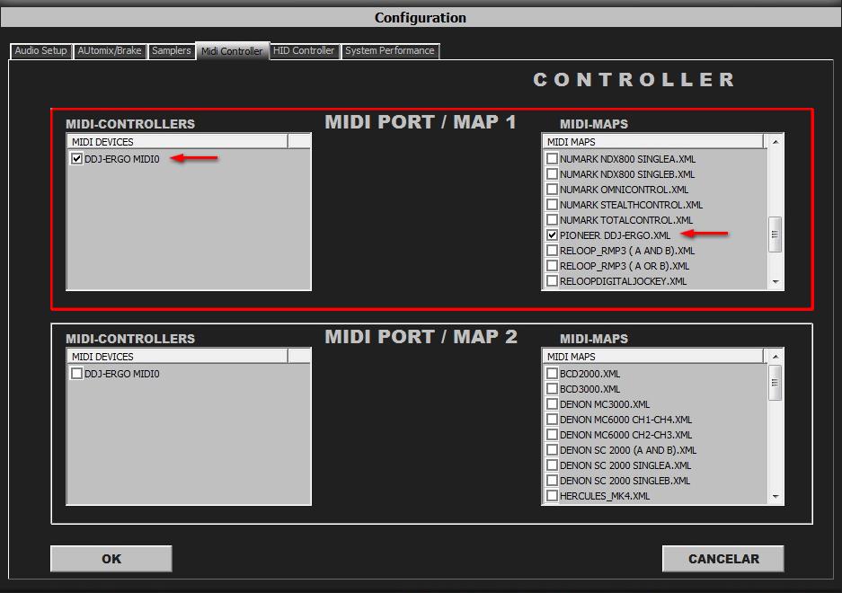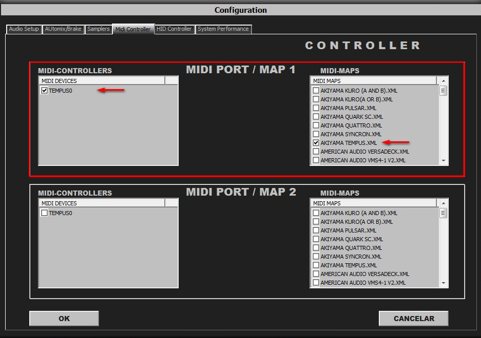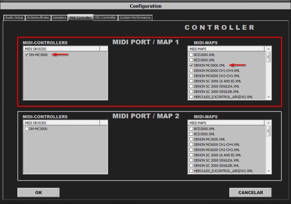 Select in MIDI PORT / MIDI MAP 1 on the left side your MIDI CD Controller device, and select on the right side the (A AND B).XML map. Nothing selected in MIDI PORT / MIDI MAP 2