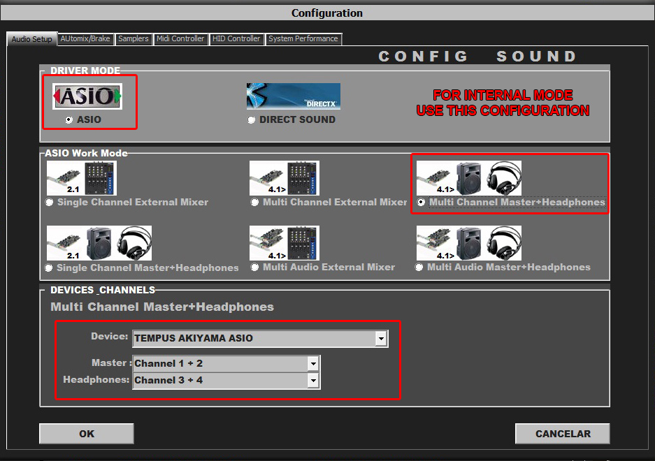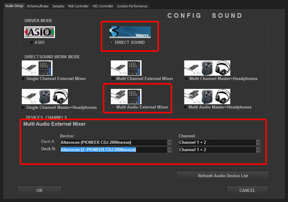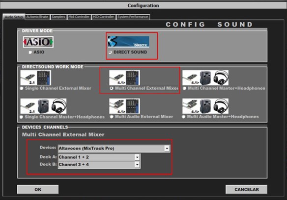 Open DJ ProMixer and go to “Config” open “Audio Setup”, here you can select your MIDI CD Controller as Audio Sound Card.
